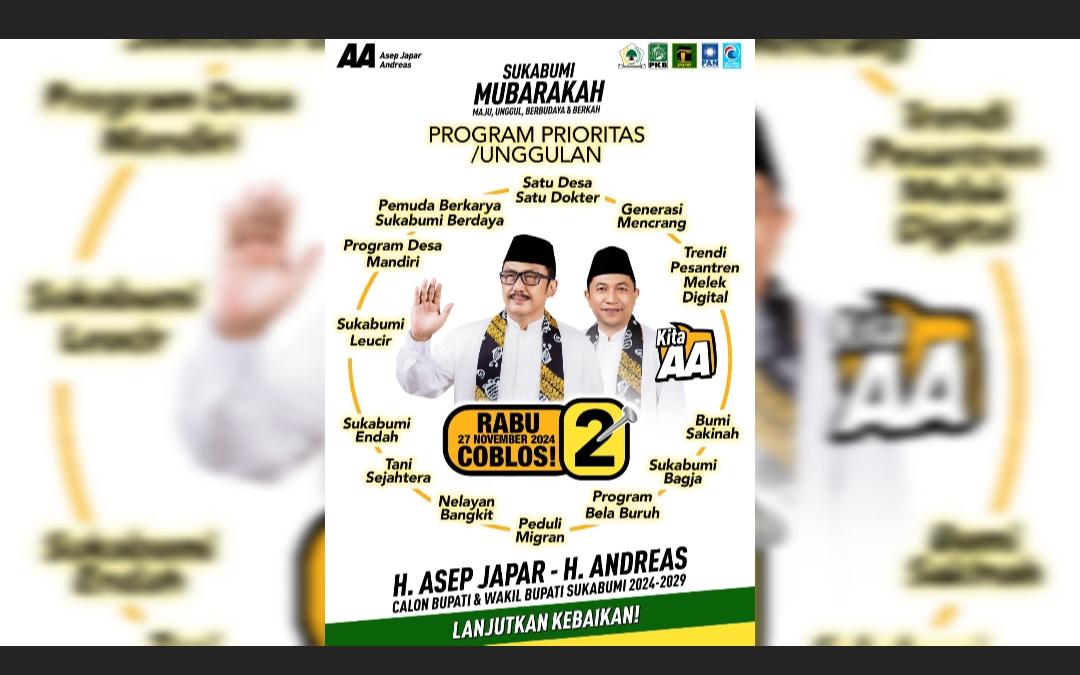 Sukabumi – Pada tanggal 27 November 2024, masyarakat Kabupaten Sukabumi akan melaksanakan pemilihan bupati yang sangat penting. Saatnya kita bersatu dan memberikan dukungan kepada pasangan calon bupati nomor urut 2, H. Asep Japar dan H. Andreas, untuk memimpin Kabupaten Sukabumi menuju masa depan yang lebih baik.