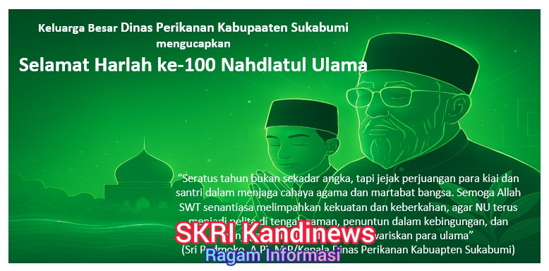 SkriKandiNews.Com,- Sukabumi, 31 Januari 2026 – Dalam semangat Sukabumi Mubarokah yang menjiwai gerak pembangunan daerah dan spiritualitas masyarakat, Keluarga Besar Dinas Perikanan Kabupaten Sukabumi menyampaikan penghormatan dan doa terbaik bagi Nahdlatul Ulama yang kini genap berusia satu abad. Seratus tahun NU bukan hanya sejarah, tetapi warisan perjuangan yang hidup dalam jiwa para kiai, santri, dan umat yang mencintai negeri ini.