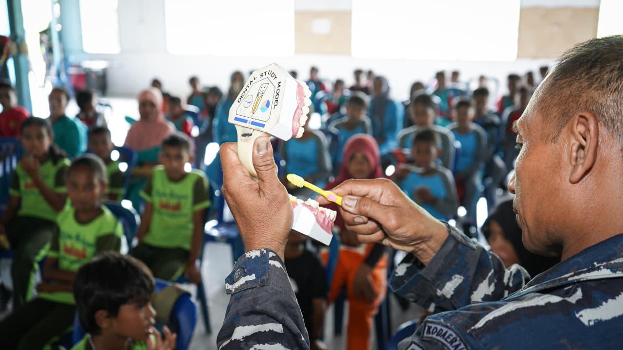 Pada kegiatan tersebut, Tim Kesehatan Kodaeral IX yang dipimpin oleh Kadiskes Kodaeral IX Letkol Laut (K) drg. Slamet Riyadi, Sp.BMM., juga membagikan 1 set alat sikat gigi kepada para siswa/siswi Desa Opin dan sekitarnya yang bertujuan agar anak-anak tersebut lebih rajin dalam merawat gigi.