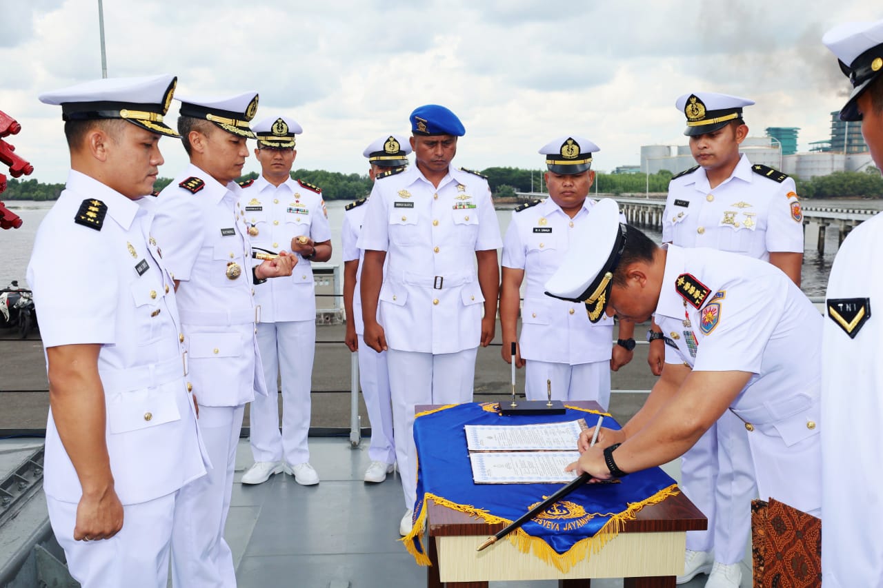 Upacara Serah Terima Jabatan Komandan KRI Imam Bonjol-383 dipimpin oleh Komandan Pangkalan TNI Angkatan Laut Dumai Kolonel Laut (P) Abdul Haris S.E., M.M.D.S., yang dilaksanakan di Geladak RBU 6000 KRI Imam Bonjol-383, Selasa (27/05/2025).