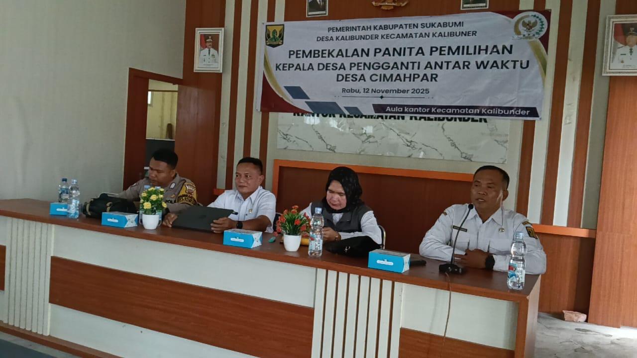 Kalibunder, Kabupaten Sukabumi – 9 November 2025, Kegiatan pembekalan panitia pemilihan kepala desa pengganti antar waktu untuk Desa Cimahpar dan Desa Kalibunder digelar di Aula Kecamatan Kalibunder, Kabupaten Sukabumi, pada Sabtu (9/11/2025). Acara ini bertujuan untuk mempersiapkan panitia agar dapat menjalankan tugas secara profesional dan sesuai regulasi dalam proses pemilihan pengganti kepala desa antar waktu.