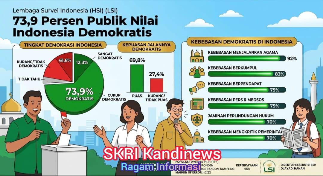 Jakarta – Mayoritas masyarakat Indonesia menilai sistem politik di Tanah Air masih berada dalam koridor demokrasi. Hasil survei terbaru Lembaga Survei Indonesia (LSI) menunjukkan sebanyak 73,9 persen responden menyebut Indonesia sebagai negara demokratis.