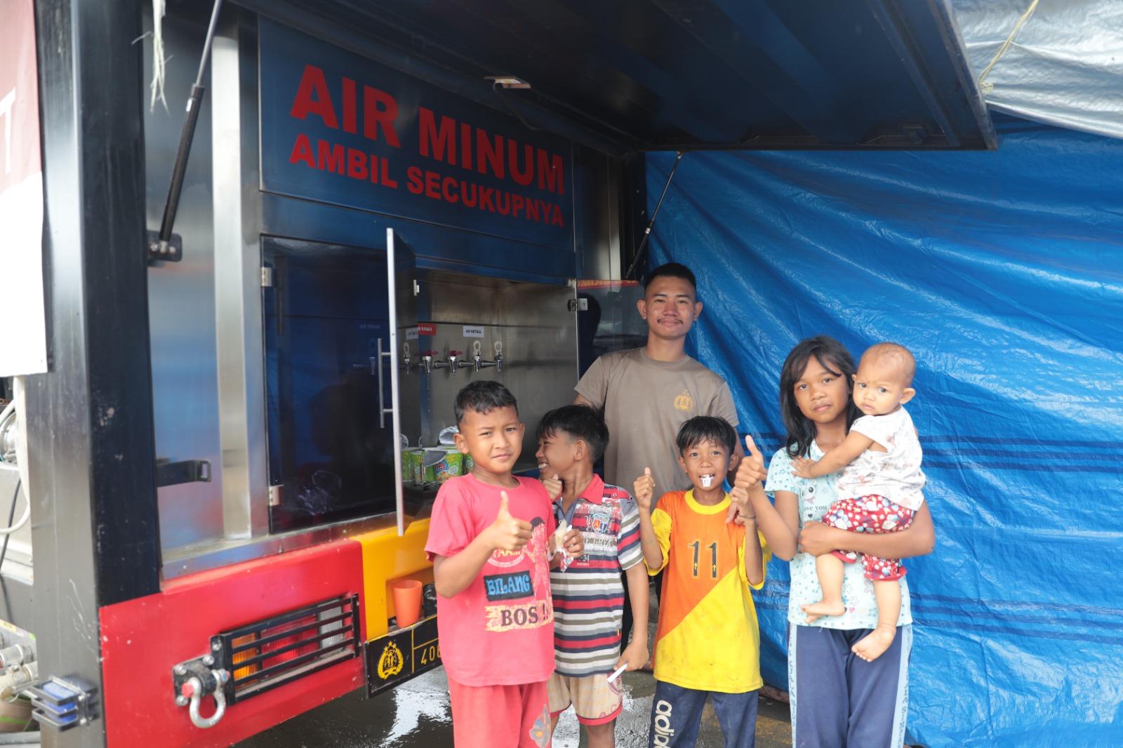 Selain dapur umum, Brimob Polri juga menyiagakan mobil pengolah air bersih (water treatment) guna memenuhi kebutuhan air minum pengungsi dan relawan. Dalam sehari, unit pengolah air tersebut mampu memproduksi hingga 16 ribu liter air layak minum, dengan kapasitas sekitar 200 liter per jam dan dioperasikan selama 20 jam setiap hari.